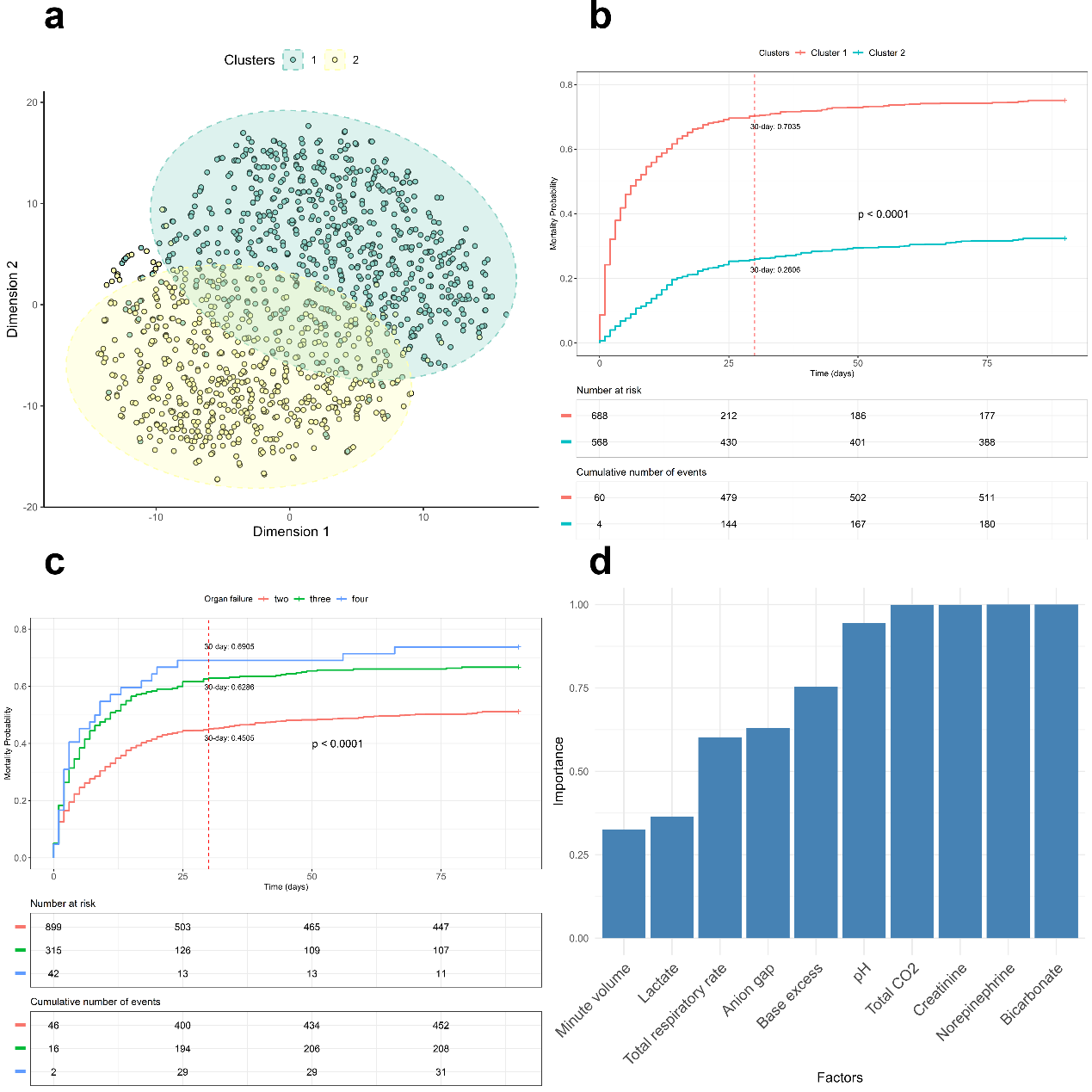 Lee-2模型聚类结果不仅展示出稳定的聚类性能,其聚类集群也凸显了特殊的临床意义。两个集群之间的死亡风险存在显著差异,亚组1的30天死亡率(70.35%)高于亚组2(26.06%)。而传统器官衰竭数量分类的方法,虽然随着器官衰竭数量的增加,慢加急性肝衰竭患者死亡率也在增加,Grade I、Grade II、Grade III的30天死亡率分别为45.05%、62.86%、69.05%,但是Lee-2模型分类后不同组别之间的死亡率差异更显著,说明Lee-2模型能够更好地区分患者的风险程度。同时值得注意的是,酸碱平衡相关变量,包括碳酸氢盐、pH、碱基过剩、乳酸和阴离子间隙在ACLF患者的聚类中发挥了重要作用,这是过往探究中很少提及的,进一步揭示了酸碱平衡在ACLF中的重要作用(图2)。
