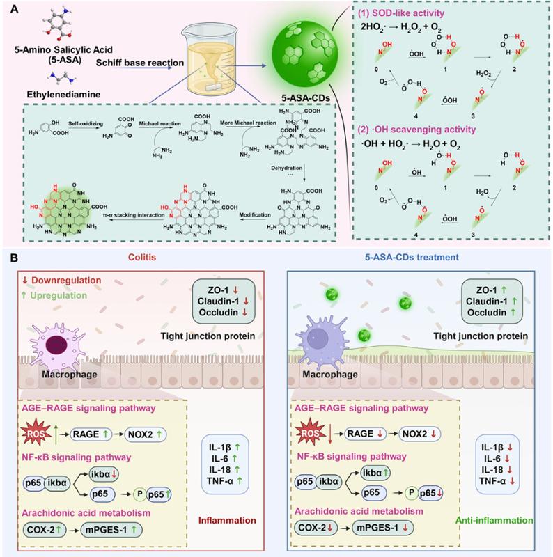 2026年1月,西安交通大学基础医学院团队在溃疡性结肠炎(UC)治疗领域取得重要突破。团队以临床一线药物5-氨基水杨酸(5-ASA)为功能前体,通过席夫碱反应常温合成碳点纳米酶(5-ASA-CDs),实现了抗氧化与抗炎功能的协同整合,相关研究成果以5-Aminosalicylic Acid-Derived Carbon Dots Nanozyme for Ulcerative Colitis Treatment via Inhibiting NF-κB/AGE-RAGE Pathway and Modulating Arachidonic Acid Metabolism为题,发表于国际权威期刊Advanced Functional Materials