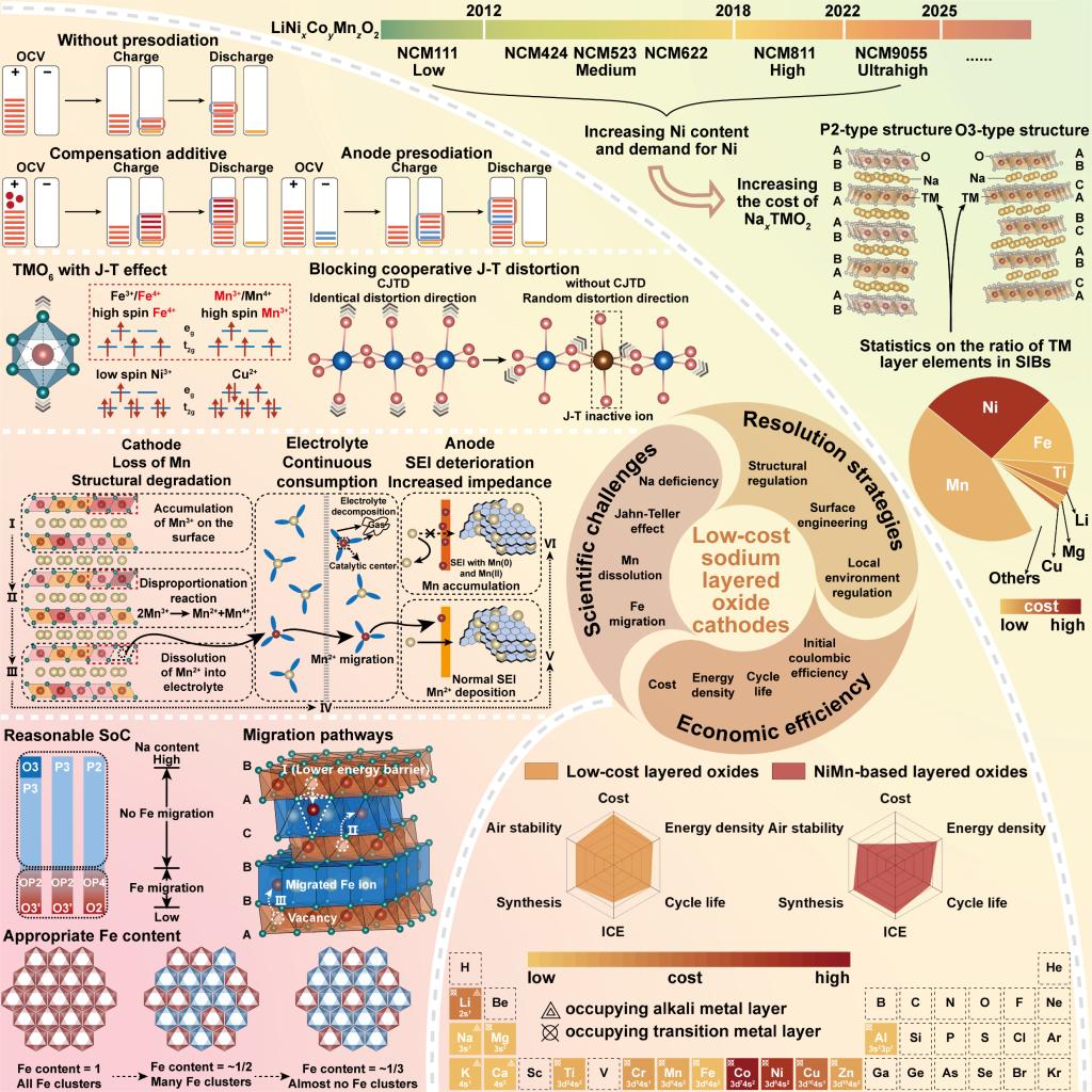 近日,西安交通大学电工材料电气绝缘全国重点实验室新型储能与能量转换纳米材料研究中心王鹏飞和刘梦婷科研团队在《先进能源材料》发表了题为《面向实用钠离子电池的低成本层氧正极:科学挑战、解决策略与经济有效性》(Low‐Cost Layered Cathodes Toward Practical Sodium‐Ion Batteries: Scientific Challenges, Resolution Strategies, and Economic Efficiency)的综述论文。