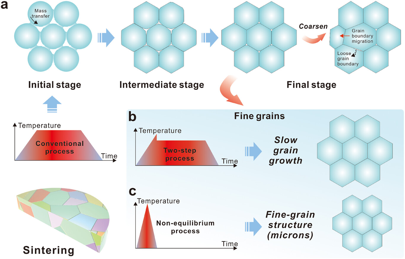 围绕这一瓶颈,相关论文《高能量输入固态电池材料的非平衡制造机制》(Non-Equilibrium Manufacturing for High-Energy-Input Solid-State Battery Materials)发表于国际权威期刊《先进材料》(Advanced Materials)。本文提出并系统阐释了一个核心科学思想:通过非平衡热输入实现热力学驱动与动力学过程的有效解耦。首先以固态电池关键材料的固相烧结过程为例,文章指出,在近平衡加热条件下,致密化所需的热力学驱动力不可避免地同步激活晶界迁移,导致致密化与晶粒粗化高度耦合。两步烧结可在一定程度上减缓晶粒长大,但仍受限于热力学主导的时间尺度。相比之下,非平衡烧结通过压缩热输入时间,快速冷却,在保留扩散驱动力完成致密化的同时动力学抑制晶界迁移,使微结构在晶粒粗化前被冻结,从而为稳定细晶结构的获得提供了新的路径。