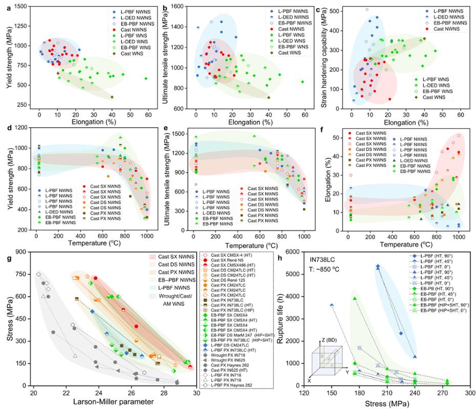 图3 增材制造与铸造、锻造镍基高温合金的拉伸与蠕变性能对比。(a-c) 打印态高温合金与传统铸件室温拉伸时屈服强度、抗拉强度、加工硬化能力及延伸率的对比;(d-f) 不同温度下打印态不可焊高温合金和对应铸件的屈服强度、抗拉强度以及延伸率对比;(g) 典型铸造、锻造及增材制造镍基高温合金蠕变性能对比;(h) 打印态镍基高温合金IN738LC的蠕变各向异性