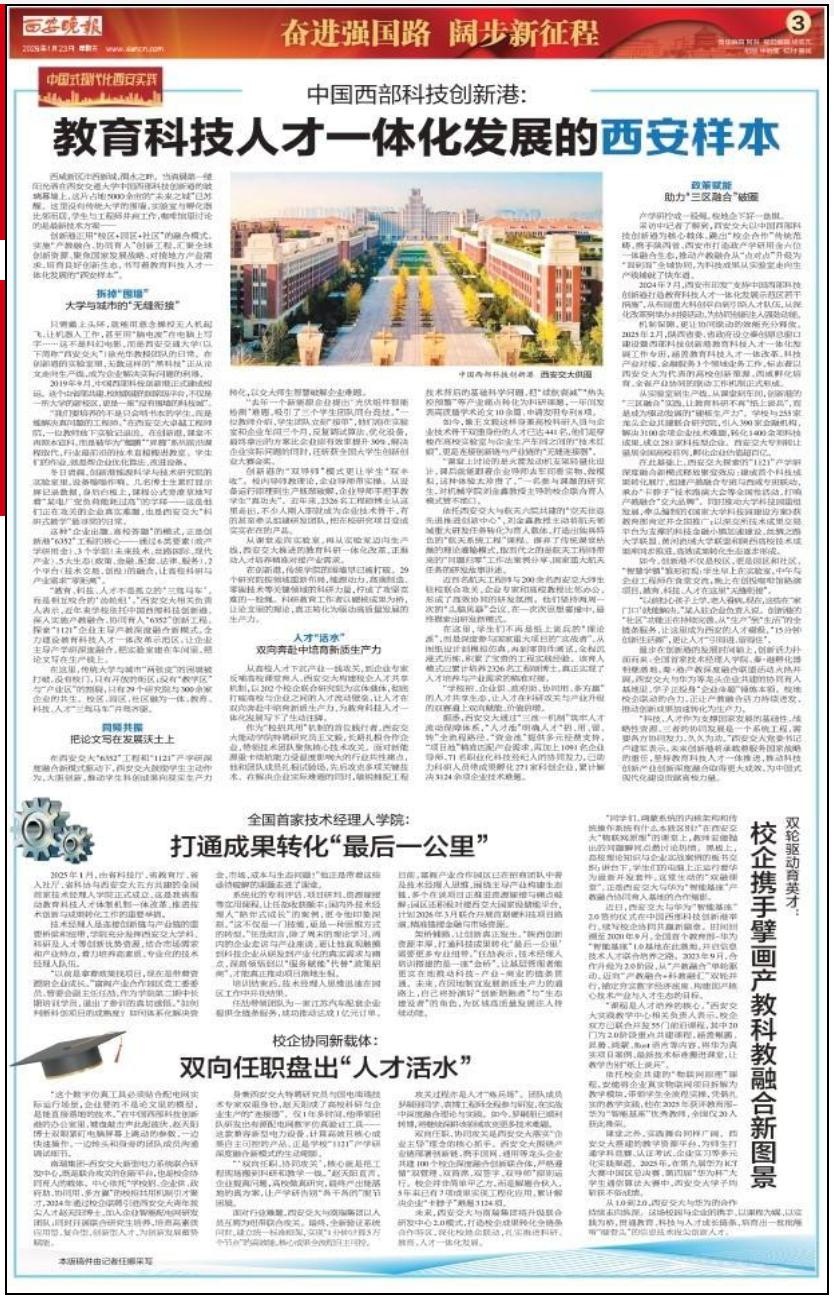 从高校人才下沉产业一线攻关,到企业专家反哺高校课堂育人,西安交大构建校企人才共享机制,以202个校企联合研究院为实体载体,彻底打破高校与企业之间的人才流动壁垒,让人才在双向奔赴中培育新质生产力,为教育科技人才一体化发展写下了生动注脚。
