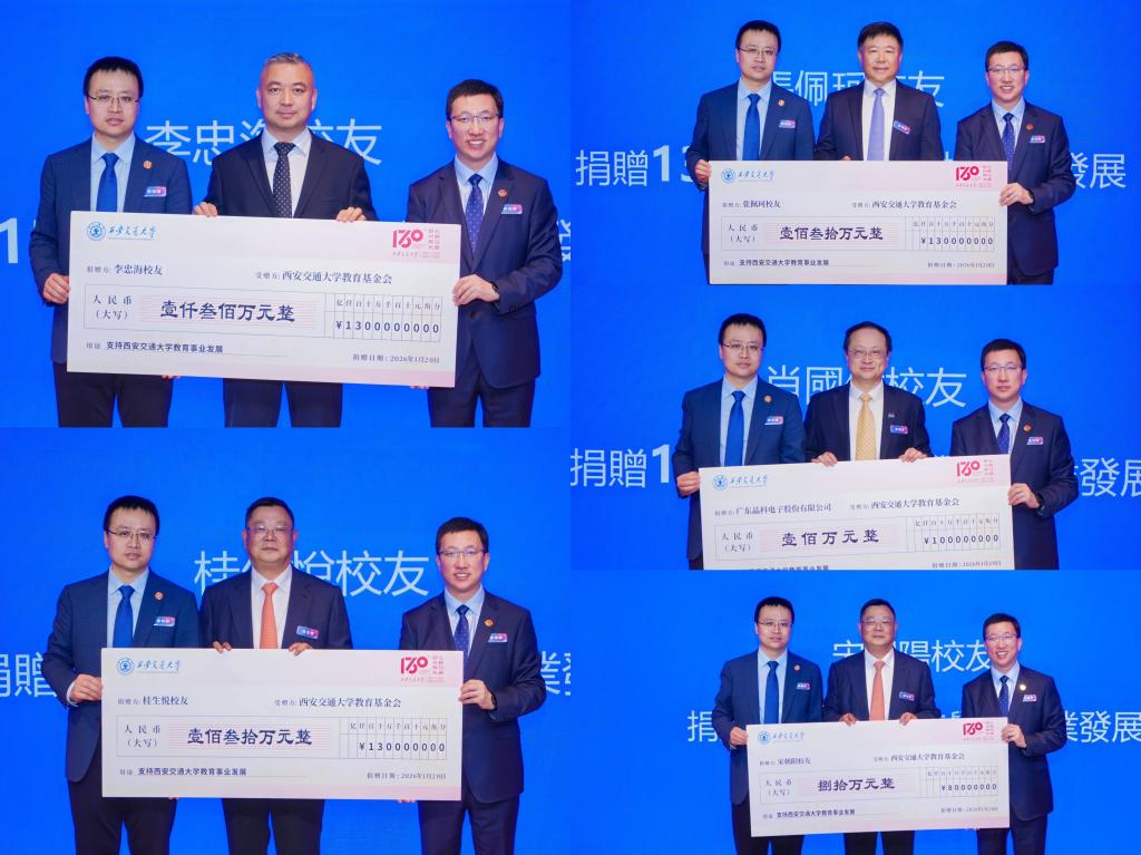 活动期间,西安交大校友捐赠仪式举办。李忠海、桂生悦、张佩珂、肖国伟、宋朝阳五位校友慷慨捐资,捐资总额人民币1700余万元,支持母校教育事业发展。张立群代表学校向各位校友表达诚挚感谢,并深情赞许校友们以实际行动回馈母校的赤子情怀,期待交大人在新的历史时期携手“为中华民族立下卓越的贡献”。