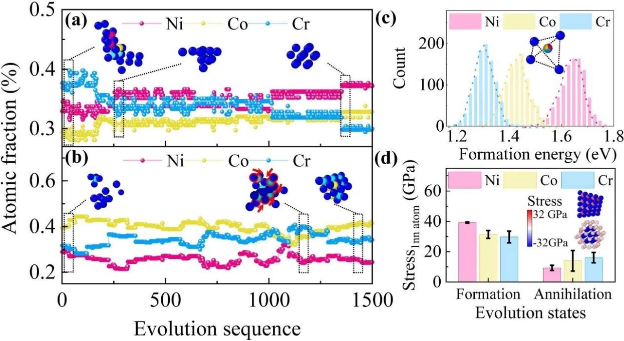 针对这一关键科学问题,该工作开发了一种基于缺陷演化速率的长时间动力学模拟(drld)方法,首次实现了具有可与实验对比的长时间尺度和原子级空间分辨信息的高效率模拟。研究团队基于drld方法,发现面心立方复杂固溶体合金在辐照条件下会通过“空位-四面体形成与解体两步演化”的物理机制形成空洞或堆垛层错四面体,其中局域化学成分变化对缺陷演化结果起着决定性作用。这一发现在原子尺度上统一解释了以往实验中关于不同元素对辐照缺陷“促进或抑制”作用的分歧现象,并与离子辐照实验结果一致,具有重要的普适意义。
