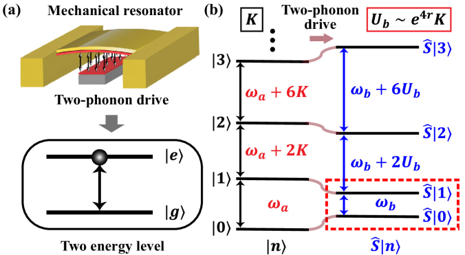图1 带有弱克尔非线性的双端固定量子谐振子示意图。施加双声子驱动时,该系统表现为高保真度量子比特而非谐振子。