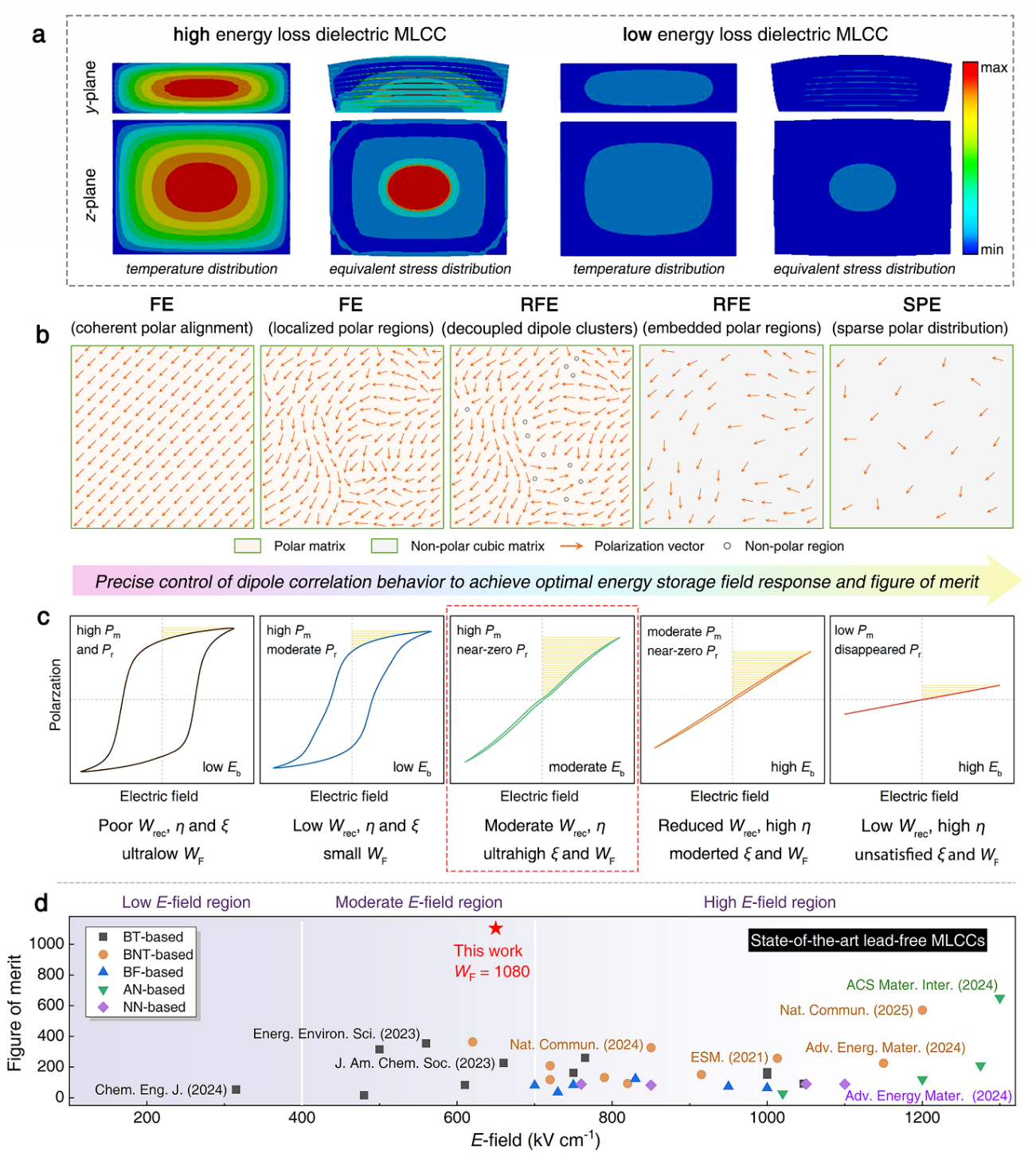图1增强弛豫铁电体储能特性的偶极子工程设计策略。a) 循环电场下,高损耗与低损耗多层电介质电容器内部模拟的温度演变和热应力分布模拟。b) 极化行为与弛豫特性随偶极间耦合强度演变的物理机制示意图。c) 不同典型铁电材料体系的P-E回线及相应的畴结构示意图。d) 不同典型储能材料的储能品质因数对比。