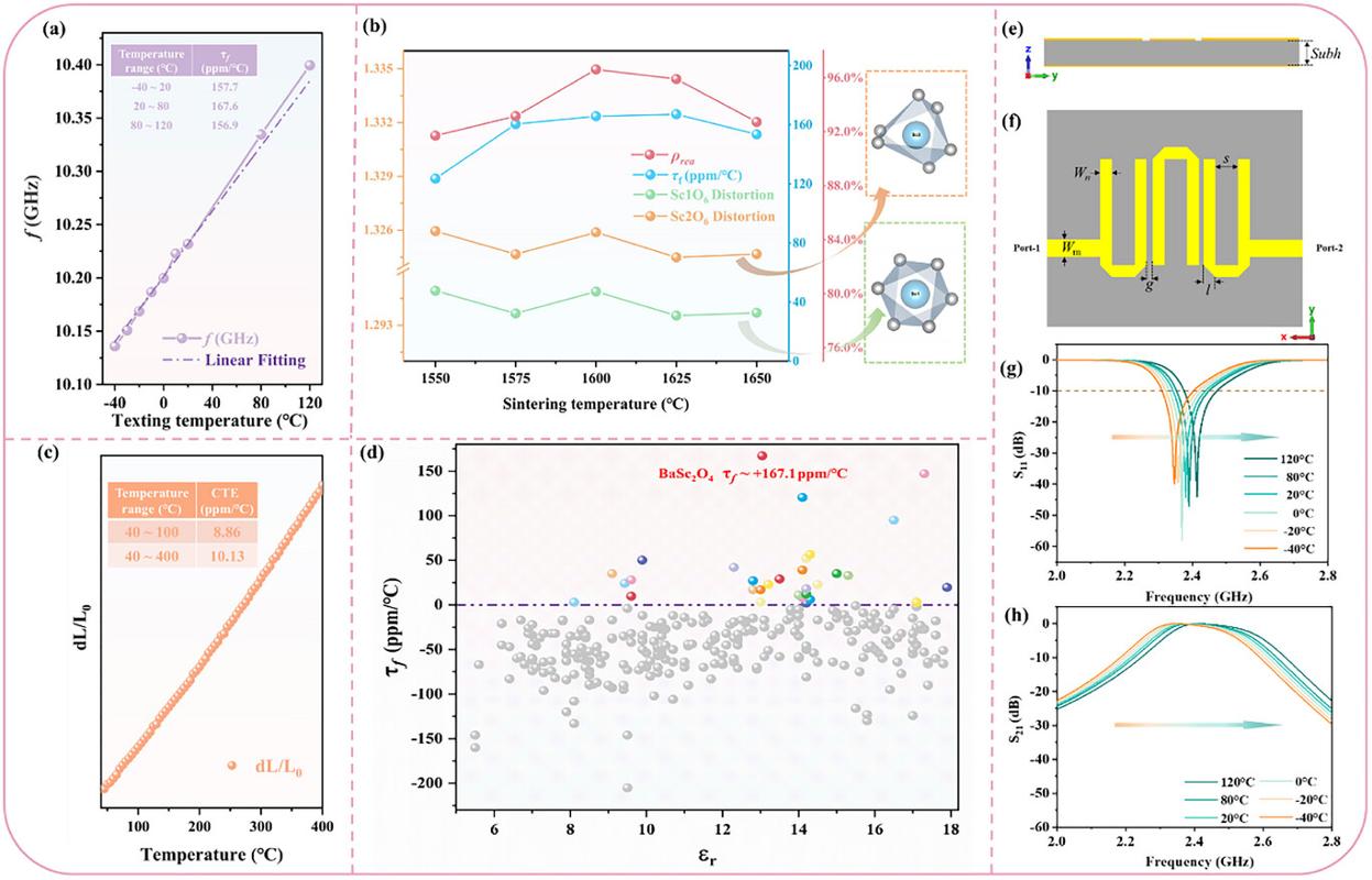 图 3:(a)BaSc2O4陶瓷谐振频率在−40~+120℃温度范围内的变化;(b)相对密度、τf值及[ScO6]八面体畸变程度随烧结温度的变化;(c)BaSc2O4陶瓷的dL/d0温度特性;(d)BaSc2O4陶瓷与同类陶瓷的τf 值对比;(e)~(f)滤波器侧/主视图;(g)~(h)模拟滤波器的S11、S21参数