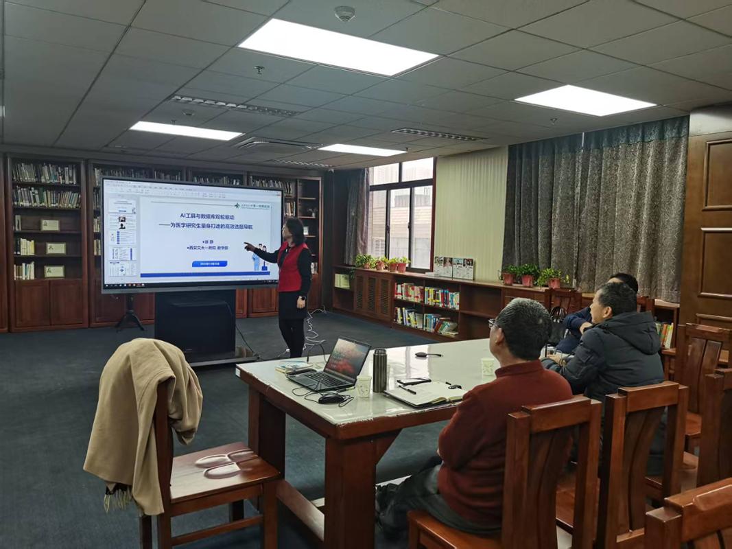 为精准对接医学科研需求,探索嵌入式学科服务与专利服务新模式,1月30日下午,雁塔校区图书馆邀请西安交通大学第一附属医院教学部图书馆徐静开展题为《AI工具与数据库双轮驱动——为医学研究生量身打造的高效选题导航》的专题座谈。图书馆副馆长魏青山、分馆主任高建忠及相关工作人员参与交流。