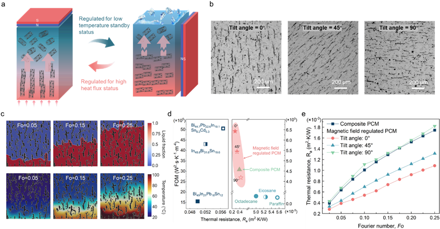 西安交通大学王秋旺教授团队联合北京大学杨林博士团队、加拿大卡尔加里大学mohamad教授团队在磁场调谐相变材料动态热管理研究方面取得重要进展,相关成果以“通过磁场控制实现变工况下的动态热管理”(dynamic thermal management under variable operating conditions through magnetic field control)为题于2026年1月23日在线发表在Nature communications(《自然·通讯》)期刊上。(论文链接:https://doi.org/10.1038/s41467-026-68715-7)团队受磁场诱导纳米颗粒聚集的启发,提出一种非接触式的磁控动态热管理策略。该策略通过在正二十烷基体中分散fe3o4@碳纳米管复合纳米粒子,利用均匀磁场诱导纳米粒子沿磁感线方向聚集排列,形成可定向调控的束状热输运网络。通过改变磁场与热扩散方向的夹角,实现同材料高效散热与良好隔热双功能的原位、可逆切换,热阻调控比达1.8倍。基于该原理构建的可调谐热管理系统,使动态间歇负载工况下的电子元件温度波动降低10.8°c,显著提升了电子设备在极端变工况下的热安全性与运行稳定性。该方法经100次以上循环验证,表现出良好的结构可逆性与性能可靠性,为高性能电子器件瞬态超高散热需求提供了可扩展的解决方案。该研究获得国家自然科学基金项目资助。