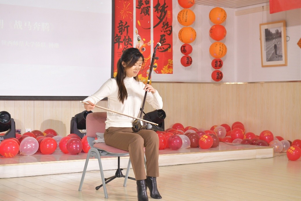陕西师范大学钟珊老师带来二胡曲目《战马奔腾》,激昂的弦音节奏明快、气势磅礴,仿佛让人置身骏马踏浪、驰骋原野的壮阔景象,生动展现出侨界儿女勇毅争先、奋勇拼搏的昂扬风貌与奋进豪情。