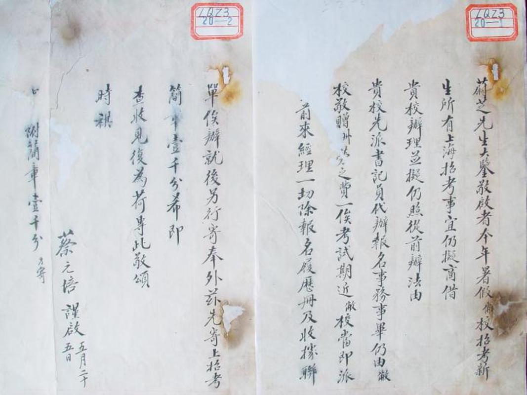 蔡元培给唐文治的书信 关于让其在上海代为北京大学招生事宜