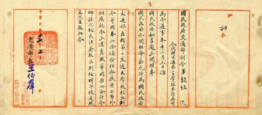 1928年交通部部长王伯群签发蔡元培就任校长的公文
