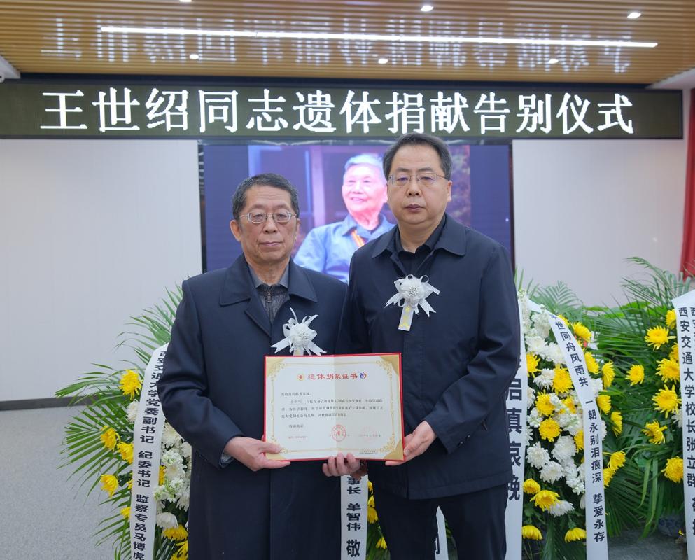 2026年2月11日,西安交通大学原纪委副书记、离休干部、第八届全国道德模范提名奖获得者王世绍同志不幸逝世,享年99岁。遵照王世绍同志生前遗愿,将遗体无偿捐献给西安交通大学医学部用于医学教学,王世绍同志用生命的最后一份力量,为医学人才培养和学科发展作贡献,完成了跨越生死的大爱传承。