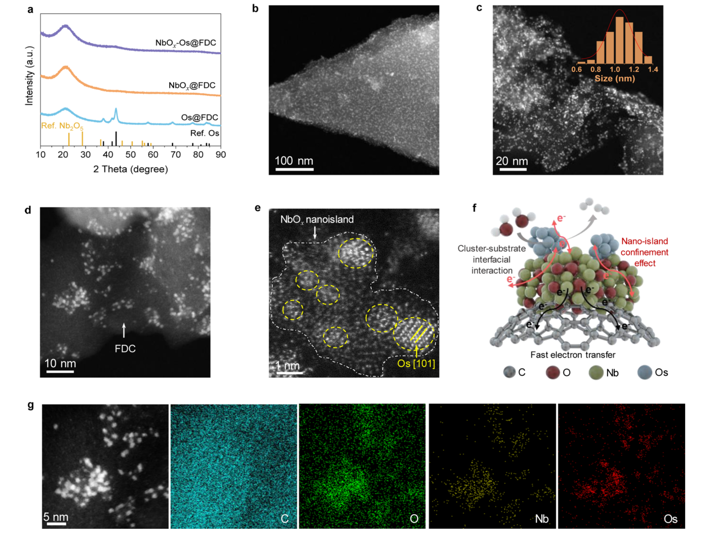 针对上述难题,西安交通大学化学学院丁书江教授团队携手北京大学郭少军教授团队提出“纳米岛限域”策略,设计并构建了一类新型Os原子簇催化剂(NbOₓ-Os@FDC)。该研究巧妙利用锚定于富勒烯衍生碳(FDC)上的NbOₓ纳米岛,实现Os原子簇的空间限域与稳定化,并同步增强界面水解离能力,从而在阴离子交换膜水电解中实现高效的碱性HER反应。研究发现,NbOₓ纳米岛构建的结构限域环境,诱导了强烈的金属-载体界面相互作用,有效稳定了Os原子簇并防止其团聚,提升了器件运行稳定性。亲氧性NbOₓ区域能够优化界面水分子排布,在反应界面富集“自由”氢键水,并强化羟基物种的吸附,从而加速水解离过程,为反应持续供给质子。此外,富含拓扑缺陷的FDC载体充当了“电子库”, 调控Os原子簇至缺电子态,进而削弱Os-H键合强度并促进H2的快速释放。基于上述设计,所制备的NbOx-Os@FDC催化剂在超低Os负载量下,AEMWE器件在1.74 V电压下即可实现1 A cm⁻²的工业级电流密度,并展现出优异耐久性。更重要的是,该器件在1.70 V下获得了509.8 A $⁻¹的价格归一化活性,相比商业Pt/C提升59倍,凸显了其在低成本绿色制氢中的显著经济竞争力。该研究为高效、稳定的非铂HER催化剂设计提供了新思路,有望推动低成本绿氢技术的规模化应用。
