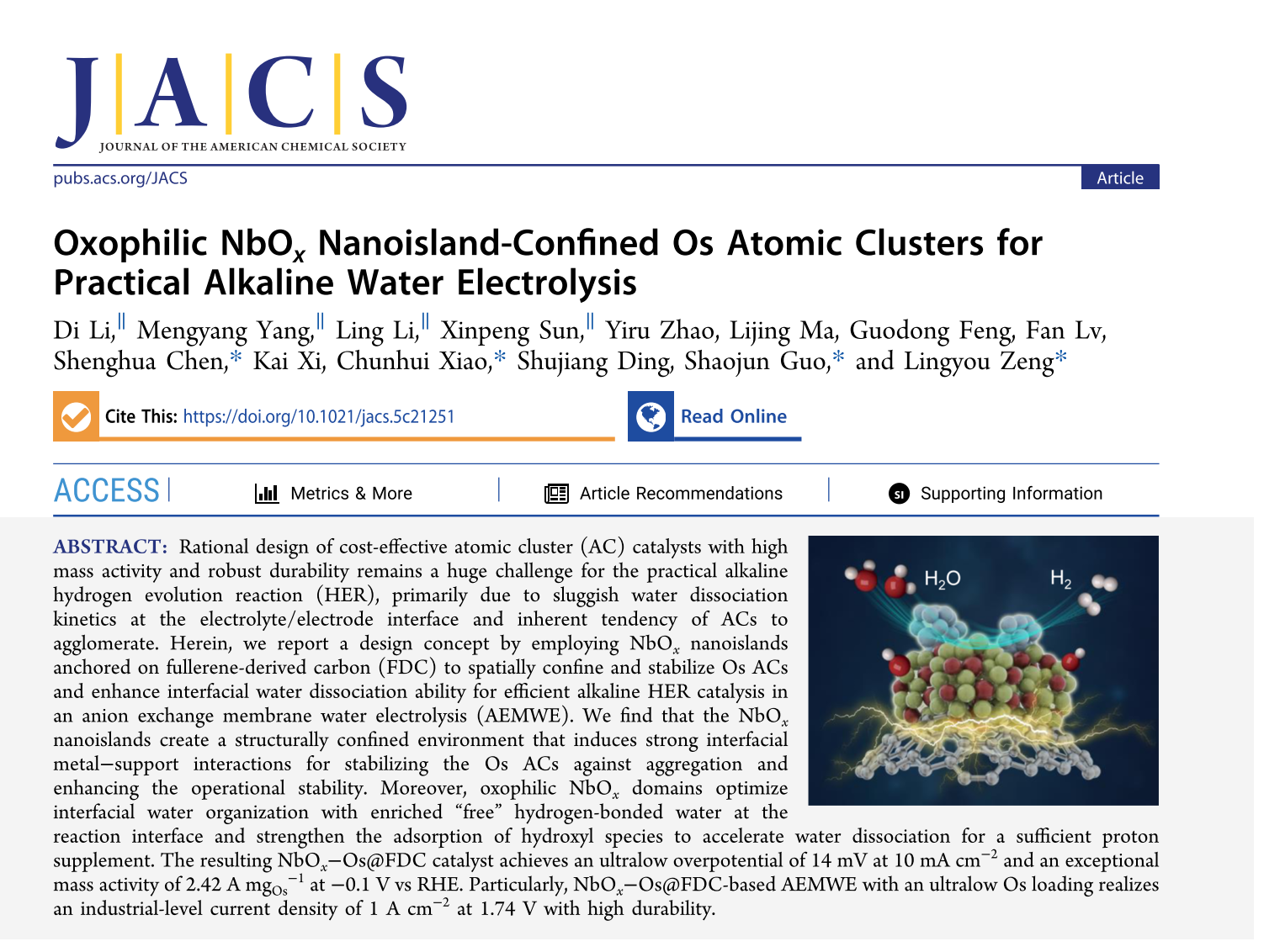该研究成果以《亲氧性NbOx纳米岛限域的Os原子簇应用于高效碱性水电解制氢器件》(Oxophilic NbOx Nanoisland-Confined Os Atomic Clusters for Practical Alkaline Water Electrolysis)为题发表于国际化学领域顶级期刊《美国化学会会刊》(Journal of the American Chemical Society)。西安交通大学化学学院为第一署名单位。西安交通大学化学学院助理教授李迪、硕士生杨梦洋、博士生李领和孙鑫鹏为共同第一作者,曾令有研究员、肖春辉教授、陈圣华教授及北京大学郭少军教授为共同通讯作者。参与本工作的还有西安交通大学丁书江、郗凯、冯国栋教授、马利静工程师以及北京大学吕帆教授等。该研究得到了国家自然科学基金、中央高校基本科研业务费、中国博士后基金等项目的资助,并获得了西安交通大学国家储能技术产教融合创新平台和西安交通大学分析测试中心在测试表征方面的支持。