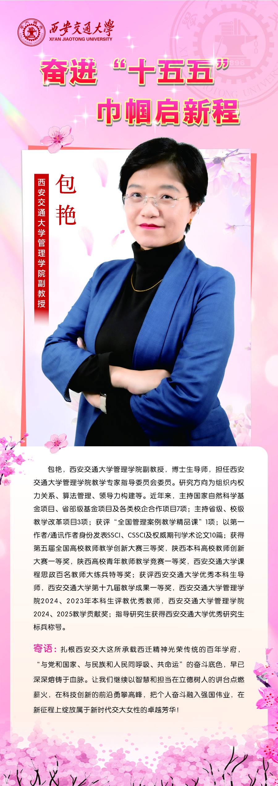 在第116个“三八”国际劳动妇女节来临之际,西安交大工会联合党委教师工作部、党委宣传部推出“巾帼建功展风采”专题报道,集中展现展示部分2025年度受表彰女教职工(团队)的先进事迹与精神风貌,引领全校女教职工传承弘扬西迁精神,爱岗敬业勇担使命,为学校高质量发展和“双一流”建设注入巾帼动能。