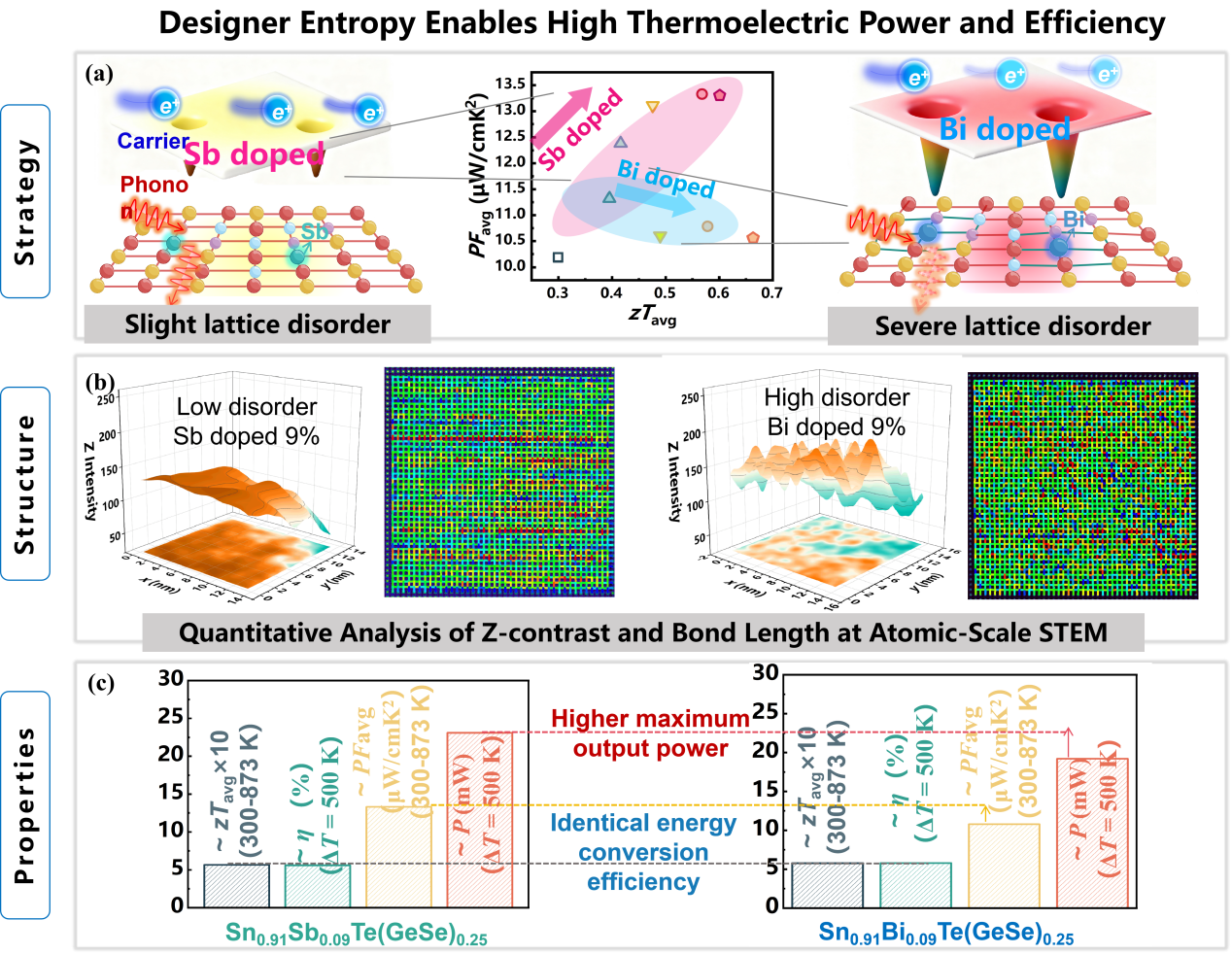 图1. (a)设计熵策略下Sb掺杂与Bi掺杂路径对SnTe(GeSe)0.25基体热电性能的差异化调控:随掺杂浓度递增,两条路径在平均功率因子(PFavg)和平均热电优值(zTavg)上的演变趋势及其分化行为。(b) 原子尺度结构起源解析:Sb掺杂(温和路径)与Bi掺杂(强扰动路径)在 HAADF-STEM Z衬度分布统计及晶格应变响应上的对比,揭示两种元素因原子半径/质量失配程度不同而引发的局部无序与应力场差异。(c) 器件级性能对比:Sn0.91Sb0.09Te(GeSe)0.25与Sn0.91Bi0.09Te(GeSe)0.25单臂器件在zTavg、转换效率(η)、PFavg 及最大输出功率(P)四项核心指标上的定量对比。
