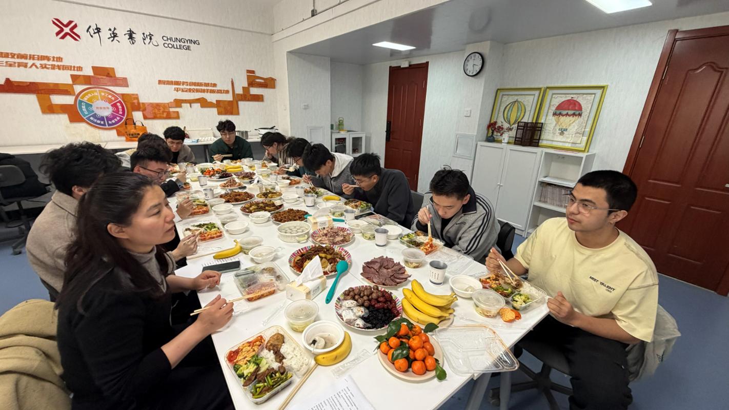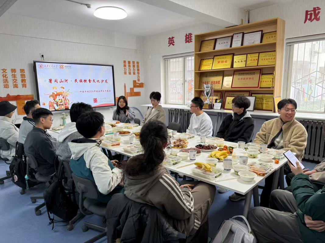 舌尖品山河,围炉话成长。学生标兵彭一城率先分享个人学习“心法”,为同学们新学期的学业发展加油鼓劲。随后,来自天南海北的同学们纷纷自我介绍,畅聊家乡的独特风物与本民族习俗,一道道特色美食背后的故事在餐桌间流转。师生围坐一堂,一边品尝融合节日与民族特色的美味,一边交流新学期的困惑与期待,老师们融入其中现场答疑解惑,小小的餐桌化作新学期师生间、同学间情感交融的 “团圆桌”。