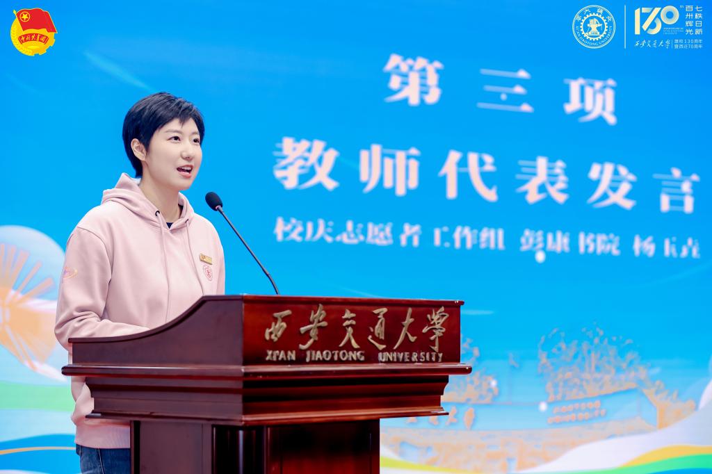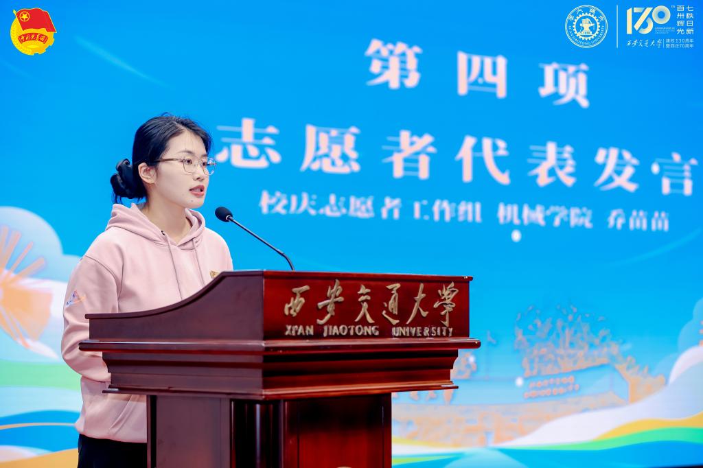 志愿者工作负责教师代表、彭康书院杨玉垚,志愿者代表机械学院硕士研究生乔苗苗分别发言。杨玉垚向志愿者们表达了期待与祝福,希望大家以严谨的态度、务实的作风投入志愿服务,在实践中成长,在奉献中闪光,展现交大学子的良好风貌。乔苗苗结合自己七年的交大志愿服务经历,向全体志愿者发出倡议,呼吁大家以青春之名同赴百卅荣光,用实干与担当为母校华诞增色,做西迁精神最坚定的传承者与践行者。