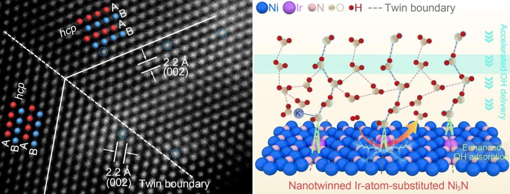 针对上述挑战,西安交通大学化工学院赵旭研究员团队提出一种简单的低温孪晶化策略诱导形成氮化镍纳米催化剂。团队研究发现,这些纳米孪晶结构可改善界面氢键网络的连通性,增强氢氧根离子的传递;也可以使价电子离域,增强氢氧根离子的吸附。从而同时解决了碱性膜燃料电池阳极氢气氧化过程中氢氧根离子“传递慢”和“吸附难”两个难题。因此,该纳米孪晶催化剂在氢气氧化过程中表现出卓越的催化性能。研究数据表明,其质量活性达到商业铂碳催化剂的5倍。同时,该催化剂亦展现出优异的抗一氧化碳中毒能力和超长耐久性,表现出良好的商业使用价值。