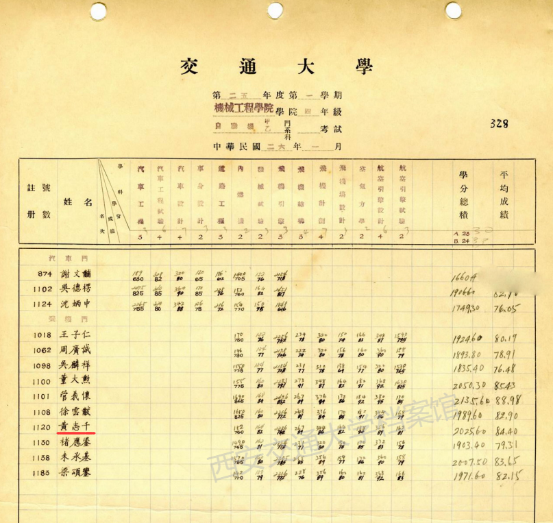 黄志千1933年考入交通大学机械工程学院。时值九一八、一二八事变后,航空救国成为时代强音。为顺应民族救亡潮流,交通大学在国内率先开设航空工程课程。1935年,在航空委员会的支持下,交大在机械工程学院增设航空工程门,成为我国最早开展高等航空工程教育的学术重镇之一。初创时期的航空工程门条件简陋,师资与设备均极为匮乏:专职教师仅有马翼周、姜长英等两位,学生从机械系高年级转入;实验设备除常规仪器外,仅配备1架四缸排式教练机、1台“旋风”式发动机,核心的风洞设备更是完全缺乏。即便在这样艰苦的条件下,学科仍稳步发展,1936年培养出首届航空专业本科生,黄志千则是航空工程门的第二届毕业生。留存至今的多份成绩单显示,大学期间,他在飞机结构、飞机引擎、飞机材料学、螺旋桨设计等专业课程中成绩稳步精进,扎实的学业功底与严谨的治学态度,为其日后投身航空事业筑牢了根基。1937年毕业前夕,黄志千获荐前往金陵兵工厂实习。同年,他又被保送进入成都空军机械学校高级机械班深造,自此踏上航空报国的实践征途。