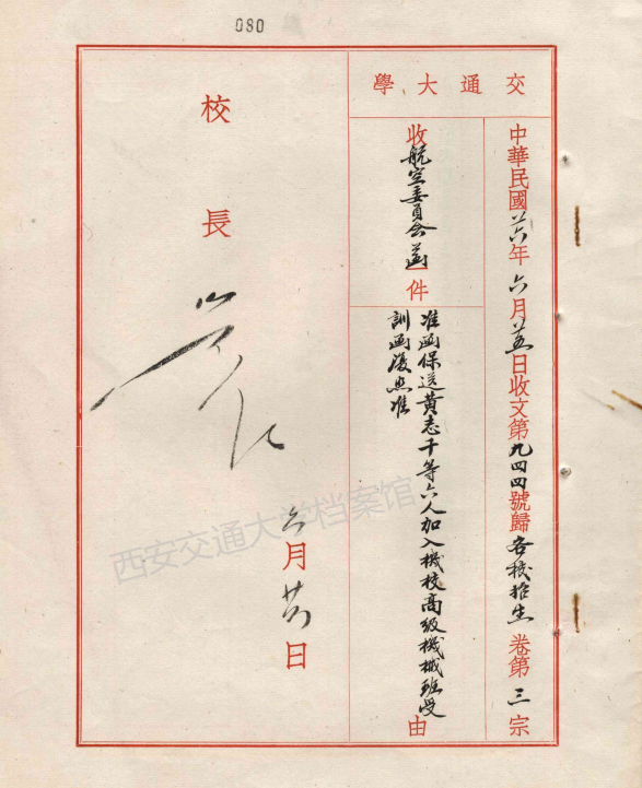 收航空委员会函,准函保送黄志千等六人加入机校高级机械班收训函复照准