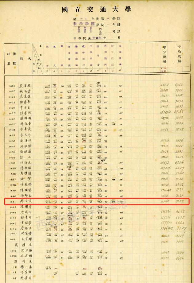 1936年,17岁的吴文俊以交通大学理学院第二名的成绩进入数学系学习。在朱公谨、武崇林等名师的教诲下,他跳出“数学只是计算技艺”的认知,深刻领悟到“数学是讲道理的”核心要义,严谨求实的学术风格自此奠基。“要在交大‘出人头地’,只有不断努力”,他如此自勉,图书馆成为他周日最常驻足之地。他最初对物理满怀热忱,直到大学三年级聆听了武崇林教授讲授的“高等代数”“实变函数论”等课程。武老师讲课不仅形象生动,精彩至极,而且追本溯源、注重本质,善于解答疑难,不仅如此,还常从家中带来数学典籍,为吴文俊“开小灶”,自此点燃了吴文俊对数学的终身热忱,并使他立志成为一个数学家。“在武老师的指导下,我的数学确实有了很大的长进,这些为我今后的成长带来了很大的帮助。”吴文俊曾深情回忆。在西安交大档案馆,如今还珍藏着吴文俊当年求学时的成绩单。1940年他以优异成绩毕业。