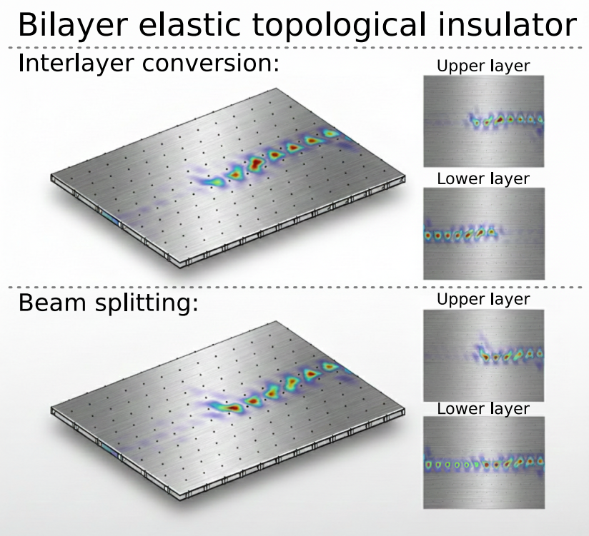 针对上述挑战,西安交通大学机械学院研究团队将弹性波拓扑绝缘体的研究扩展到二维平面法线方向上的双层区域。同时,在弹性波结构中实现有效模型具有固有的挑战性,这源于其全矢量特性以及纵波和横波分量之间复杂的耦合。通过夹紧双层结构的上下突出端面来消除纵波的影响,从而实现对结构内横波的直接控制。基于这种边界配置,团队设计并制造了支持两种不同类型边缘态的双层弹性结构,即层混合边缘态和层极化边缘态—这些边缘态源于额外的层自由度。这个双层平台可作为探索弹性波系统中拓扑物理的通用测试平台,并为先进应用(如高容错性的层间转换器和分束器)开辟了新的途径。