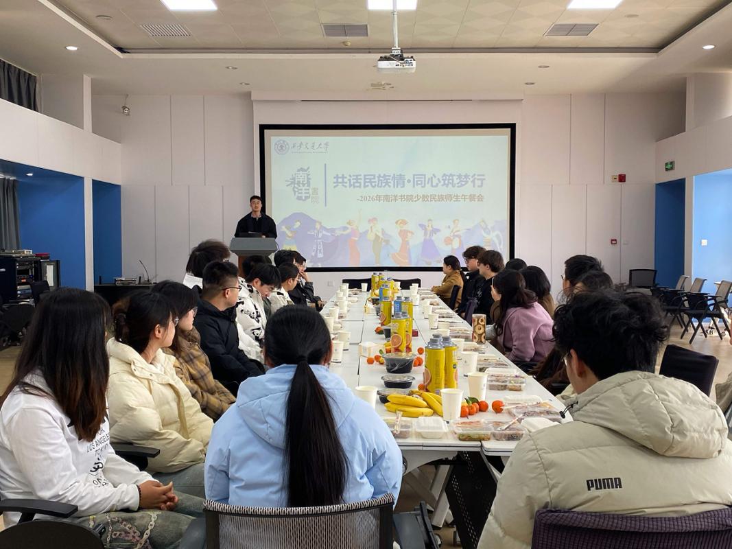 为进一步铸牢中华民族共同体意识,关心关爱少数民族学生成长发展,3月9日中午,南洋书院召开2026年首场“共话民族情·同心筑梦行”少数民族师生午餐会。会议由南洋书院辅导员马楠主持,南洋书院院务副主任顾蓉、励志书院院务副主任兼“同心圆”民族团结工作室负责人库来西·依布拉音,辅导员马黛露丝、雷恒宇,与书院20余名少数民族学生代表共进午餐、共话理想、共叙情谊,午餐会还邀请高年级少数民族学生代表尹李姣、昊毕图、郭晓湉分享成长经验。