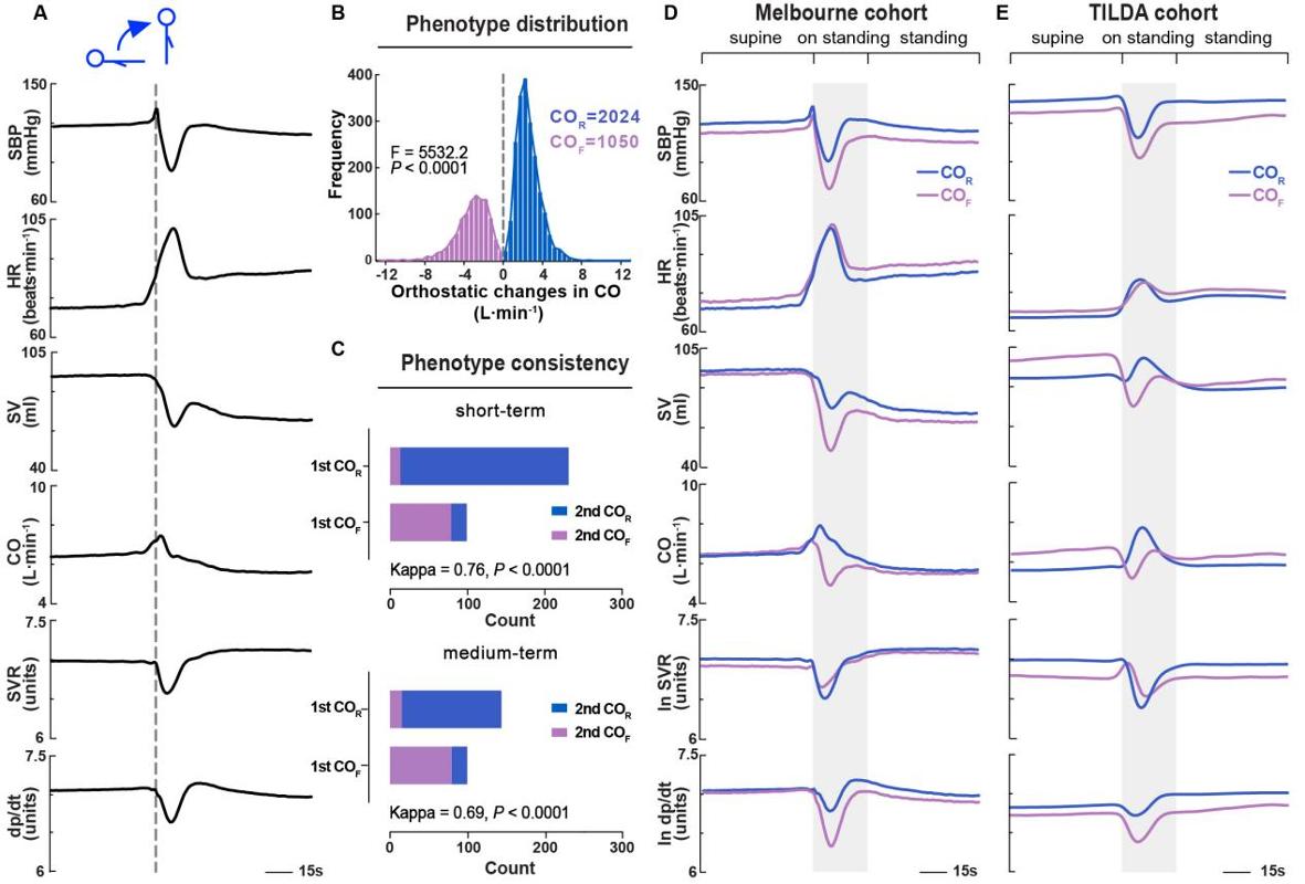 研究基于两个前瞻性队列,对3074名健康年轻人和3025名50岁以上老年人的标准化主动站立试验数据进行系统分析。结果显示,人体在站立初期的心输出量变化呈现两类稳定的应答模式:一类为心输出量短暂升高型(COR型),占年轻人66%、老年人78%;另一类为本研究首次识别的心输出量短暂下降型(COF型),占年轻人34%、老年人22%。多次复测结果表明,该表型具有良好的个体稳定性,是此前未被识别的心血管自主调节应答模式。
