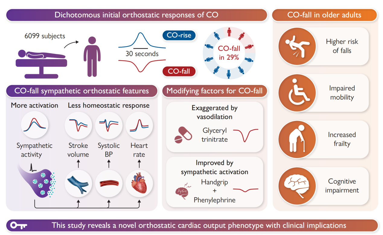 本研究首次发现并表征了站立时心输出量的COF新型应答表型,明确其为外周自主神经调节紊乱的一种表现形式。该发现突破了传统研究仅以血压变化为核心指标的单一范式,为理解人体站立时的心血管调节机制提供了新的视角,也为识别老年人群心血管健康风险、评估跌倒及功能衰退风险提供了新的生物标志物和科学依据。