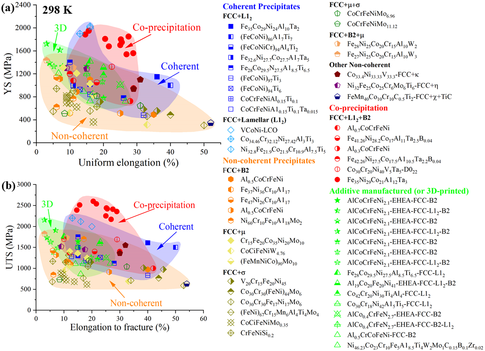 图1. 不同析出相强化多主元合金(由传统铸锻和增材制造工艺制备)的强度-延性汇总,