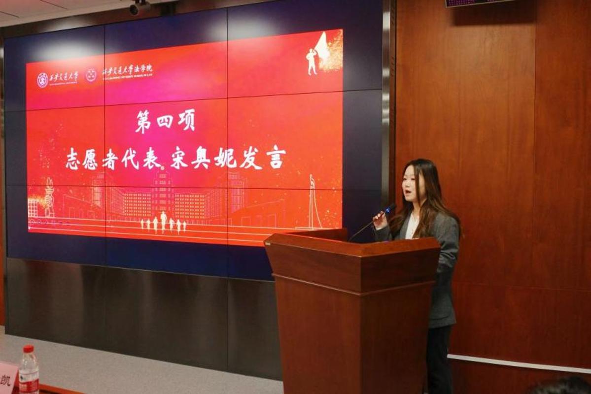志愿者代表宋奥妮在启动仪式上回顾了学院此前在“宪法宣传周”、模拟法庭、社区普法等活动中积累的实践经验,坦言法律的真谛在于为民解忧。面对崭新的征程,她代表全体队员庄严承诺:将做公平正义的“守护者”,确保服务专业精准;做群众身边的“贴心人”,深入基层倾听诉求;做雷锋精神的“传承者”,在奉献中实现个人价值与社会责任的统一。她表示,这是一场知识与实践的双向奔赴,西交法律青年已准备好用脚步丈量法治中国的基层纹理。