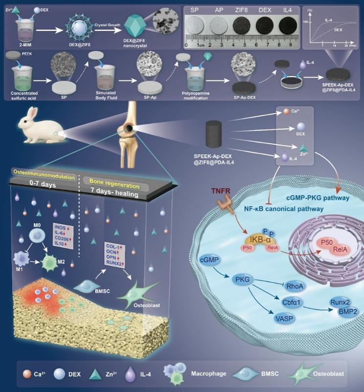 在磺化处理后的PEEK表面构建仿生磷灰石层,再利用聚多巴胺将搭载地塞米松的金属有机框架物ZIF-8纳米颗粒固定在材料上,同时吸附白细胞介素-4。这样就形成了一种具有时序释放功能的复合涂层,这种涂层的工作机制很简单:植入早期,白细胞介素-4快速释放,发挥免疫调节作用,促进巨噬细胞向抗炎表型转化,为后续骨再生创造有利的微环境。植入中后期,地塞米松和锌离子缓慢释放,持续促进成骨细胞分化,加速新骨形成。体外实验和兔股骨缺损模型证实,这种时序调控策略有效抑制了早期炎症反应,抑制NF-κB炎症通路、激活cGMP-PKG成骨通路,最终显著促进了新骨形成和骨整合。