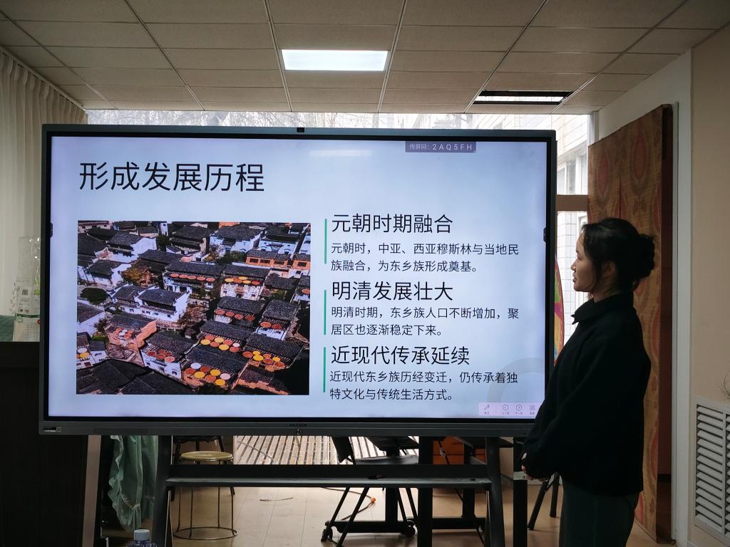 预科2502班马素菲同学为大家介绍了自己的民族——东乡族。她从民族概述、文化特色、社会生活以及民族精神等四个方面为大家展开详细介绍。在场的同学们惊叹于东乡族的手抓羊肉、馓子等美食,也被东乡族团结互助、尊老爱幼、勤劳节俭的民族精神所感染。