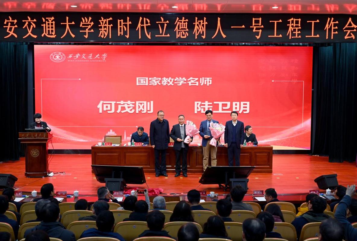 卢建军、张立群为国家教学名师获得者,能动学院教授何茂刚、马克思主义学院教授陆卫明颁发纪念杯。