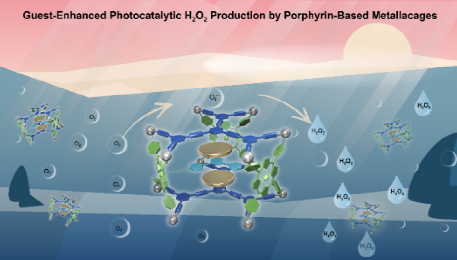 针对上述难题,西安交通大学张明明教授团队提出了利用离散金属有机笼作为超分子光催化剂的解决方案。研究团队发展了一种模板导向的正交配位自组装策略,成功构建了两种结构精确、具有明确双空腔结构的卟啉基金属配位笼。该金属笼巧妙地集成了光活性的锌卟啉单元与电子受体三嗪单元,形成了固有的分子内给体-受体结构,从而在可见光照射下可实现高效的光诱导电子转移与电荷分离。进一步,研究团队利用金属笼的双空腔特性,封装了富电子的平面芳香客体分子(如三亚苯、苯并三噻吩),构建了一系列主客体复合物。研究表明,客体的封装能够有效稳定光生电荷分离态、显著延长载流子寿命,从而大幅提升了体系的可见光催化产H2O2性能。在最优条件下,其H2O2生成速率可达4037 µmol g⁻¹ h⁻¹,在可见光驱动的超分子光催化剂中性能位居前列。