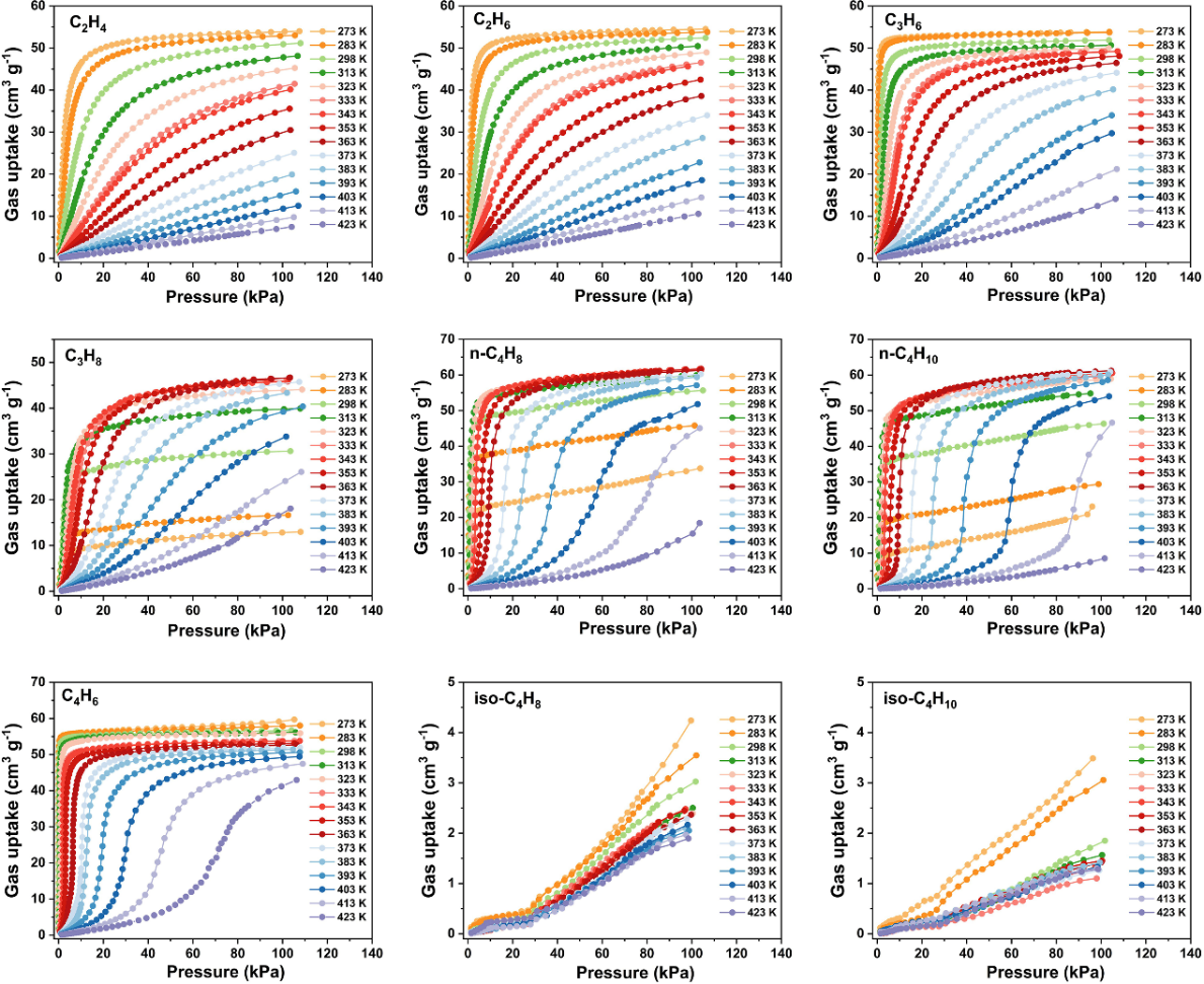 基于这一特性,CALF-20可在热力学选择性吸附、动力学分离、分子筛分及门控柔性吸附四种分离机制之间灵活切换,实现对九种工业关键低碳烃的高效分离。在丙烯/丙烷分离中,该材料可通过调节温度实现吸附选择性的反转,低温下即可高效分离丙烯/丙烷的混合气。在丁二烯纯化方面,CALF-20能从C4混合气中选择性分离出纯度超过99%的丁二烯,室温条件下纯度仍保持在93%以上,展现出良好的工业应用潜力。