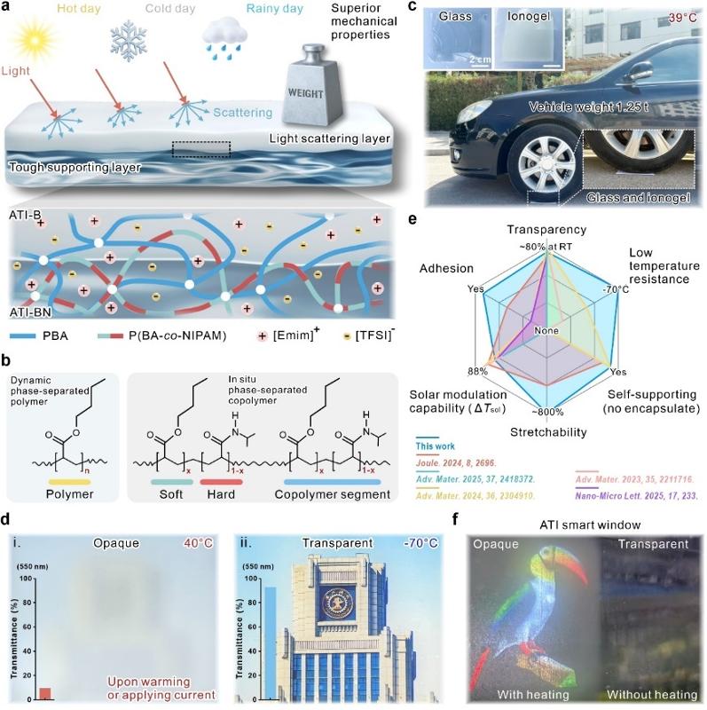 针对这一挑战,西安交通大学物理学院的研究团队提出了一种创新的材料设计与制备策略,成功研发出一种坚韧的非对称热致变色离子凝胶(ATI)薄膜。该研究通过巧妙的“动态-原位相分离”方法,将热响应光散射层与机械支撑层共价结合,制备出具有“Janus”非对称结构的离子凝胶薄膜。