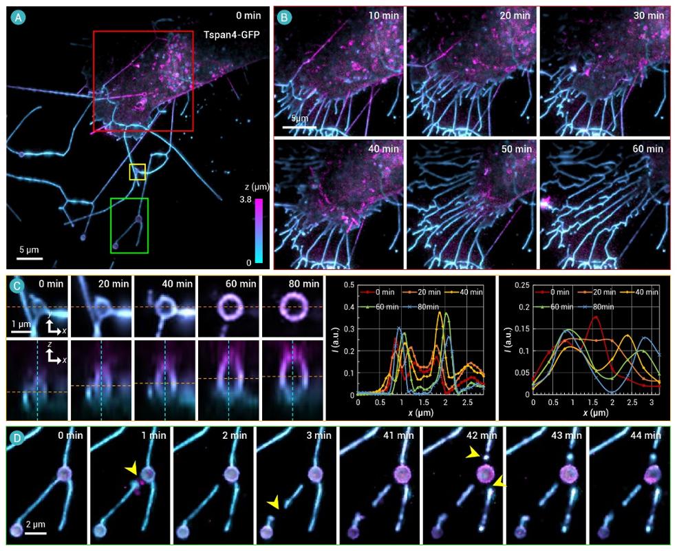 图4 迁移中的Tspan4-GFP标记的NRK细胞及其迁移体的动态延时成像。(A) 初始时刻迁移细胞的高度伪彩MIP图像。(B) 图A中红框区域的细胞迁移过程,可见细胞尾部留下收缩纤维。(C) 图A中黄框内迁移体的生长过程。分别展示了沿橙色线的xoy平面和xoz平面截面图,并测量了沿橙色线和蓝色线的荧光强度变化。(D) 图A中绿框内迁移体的断裂过程。
