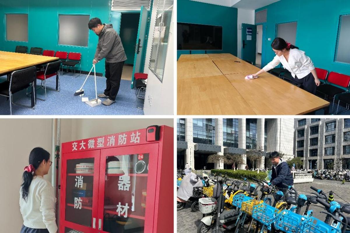活动过程中,学院教师主动带头、广大学子踊跃参与,有序投入劳动实践,聚焦卫生死角清理、杂物垃圾清运、公共设施维护等重点工作,深入推进校园室内外环境全方位整治。从会议室桌椅擦拭、地面清扫,到微型消防站器材点位规范检查;从公共区域杂物规整,到校园共享车辆有序摆放,细致排查每一处细节,全力打造整洁、有序、宜居的校园环境,生动展现了人居师生的责任担当与向上风貌,以实干行动为校庆筹备工作添砖加瓦。