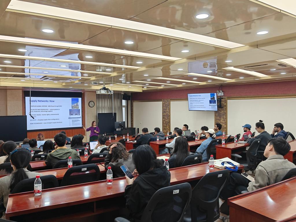 学术讲座中,布林特鲁普教授以《人工智能助力复杂供应链网络》为题,系统阐述了数据驱动时代下供应链的发展现状与核心驱动因素,讲解了人工智能的内涵与外延及其在供应链场景中的典型应用,并分享了网络分析、数字化供应链监控、集体学习、分布式决策与自动化等前沿研究案例。