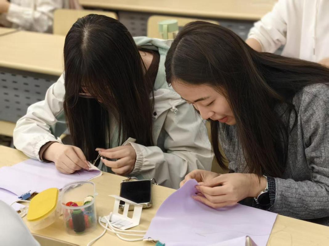 在实践制作环节,同学们按照老师教授的方法,将准备好的布料按要求铺在一起,随后开始进行缝纫操作。对于部分初次接触布艺手工的同学,老师与身边熟练的同学主动伸出援手,手把手指导针法,帮助大家克服缝纫难题。从简单的穿针引线,到平针缝合、包边处理,再到内外袋嵌合、袋口收边,同学们全神贯注,一针一线细致操作,彼此交流心得、互相帮助,现场充满了团结协作的温馨氛围,大家在欢声笑语中耐心地进行各自收纳包的缝制。