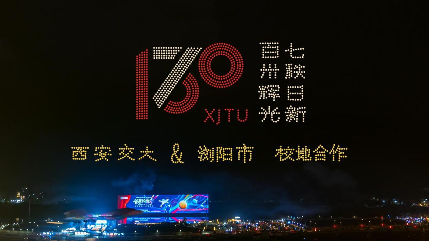 夜幕之下,“花炮之乡”浏阳以一场主题烟花秀与无人机光影表演,祝贺西安交通大学建校130周年暨西迁70周年华诞,祝愿校地合作再结硕果、共谱新篇。