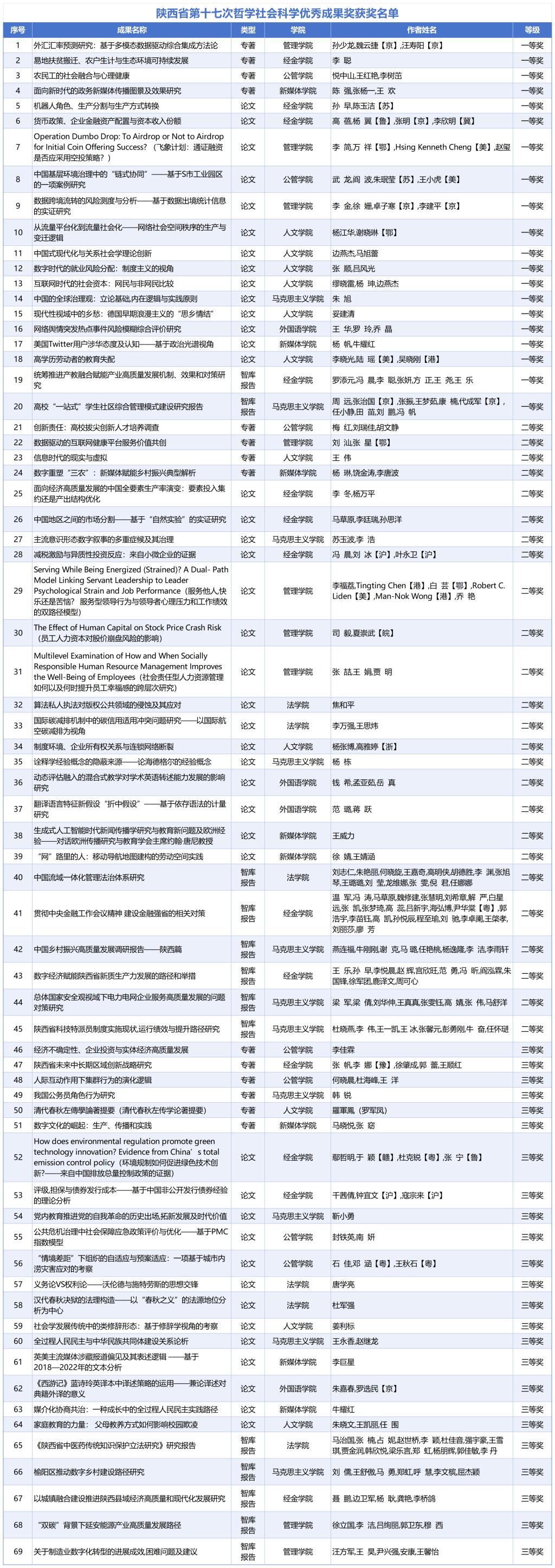 近日,陕西省人民政府发布关于表彰第十七次哲学社会科学优秀成果的通报,西安交通大学组织申报238项,获奖69项,其中一等奖20项、二等奖25项、三等奖24项,总数较上届增加9项,获奖数量持续攀升。