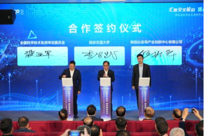 图1 西安交通大学与全国科学技术名词审定委员会签署了全国生物信息学名词审定委员会秘书处建设协议,与长安先导产业创新中心签署共建框架协议(左);全国科学技术名词审定委员会专职副主任裴亚军(右一),校党委副书记王欢(右二)中国工程院院士、西安交通大学校长张立群(右三)等出席。