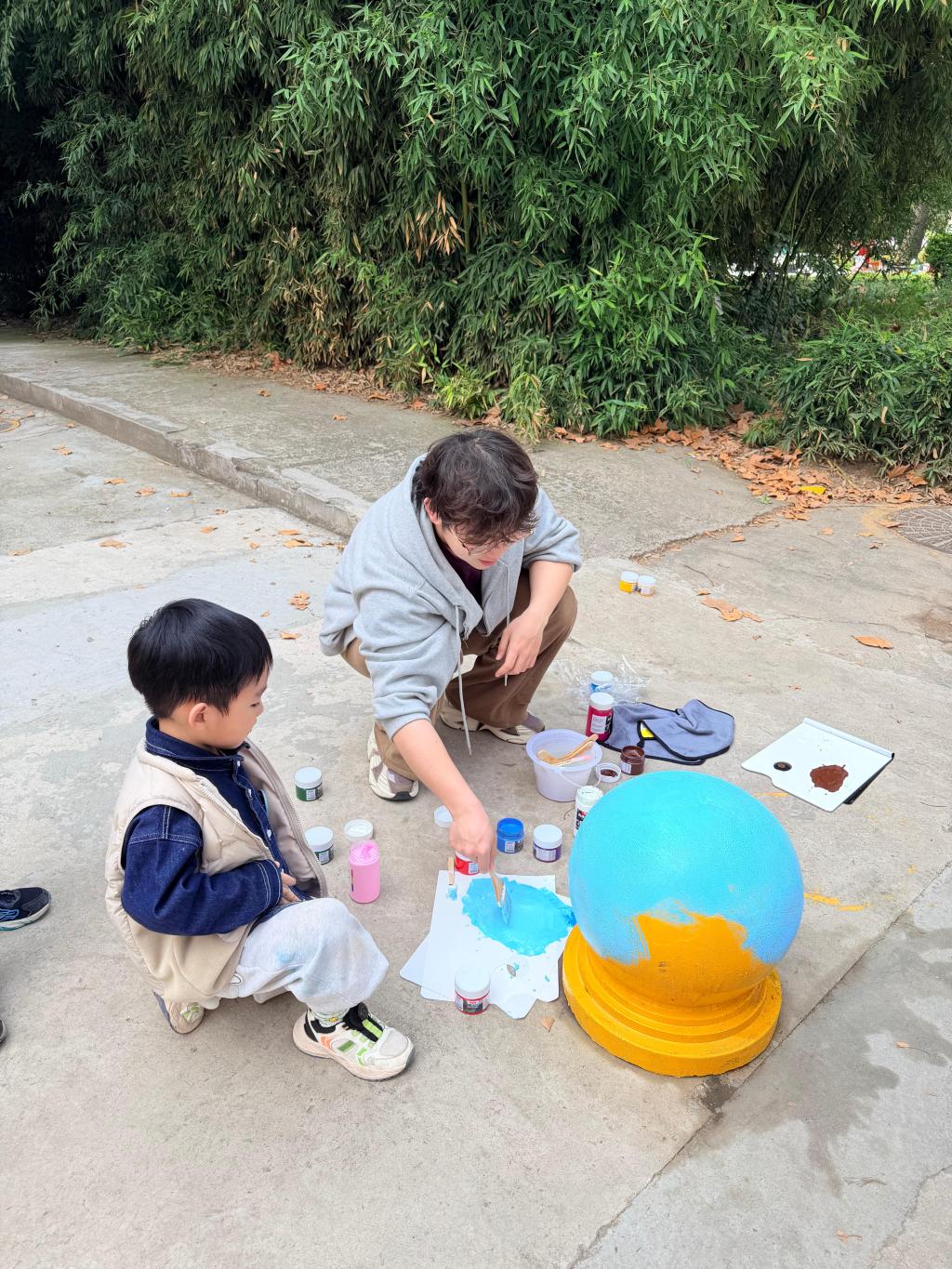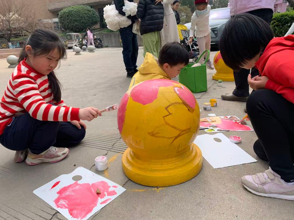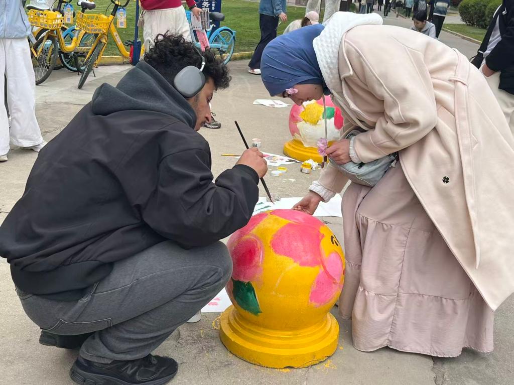 同学们的创作热情高涨,他们手中的画笔竟也像投入湖中的一颗石子,激起了层层涟漪,不少路人被色彩吸引,主动询问能否参与。艺术系学生热情邀请路过学生、小朋友拿起画笔,在石墩上留下自己的创意。小朋友用稚嫩笔触为石墩增添童真趣味,国际留学生的加入让石墩也成为文化交流融合的小窗口。“绘画过程中引来不少师生驻足围观,也有很多小朋友加入,这让我们觉得很惊喜。在这个过程中大家都很友好、友善,人与人之间的情感交流让我们很感动。”环设2501班于滟兮和胡馨予说道。