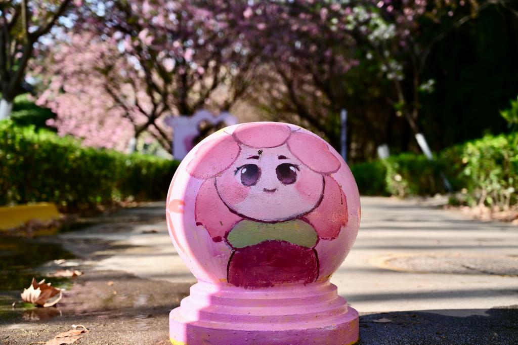 活动前期,同学们集思广益,结合樱花节主题与校园文化特色,精心构思设计方案,将樱花元素融入创作之中。保卫处积极配合,提前清理石墩表面,并梳理数量、位置等信息,为活动开展做好准备。活动现场,同学们分工协作,从起稿、调色到上色、精修,每一笔都倾注着对学校的热爱与对校庆的祝福。画笔下的樱花或含苞待放、生动可爱,或肆意盛放、绚烂多姿,一笔一画间,春日灵动与青春创意一一定格。绘制完毕后,保卫处队员与同学们协作对石墩进行了后续防水保护。