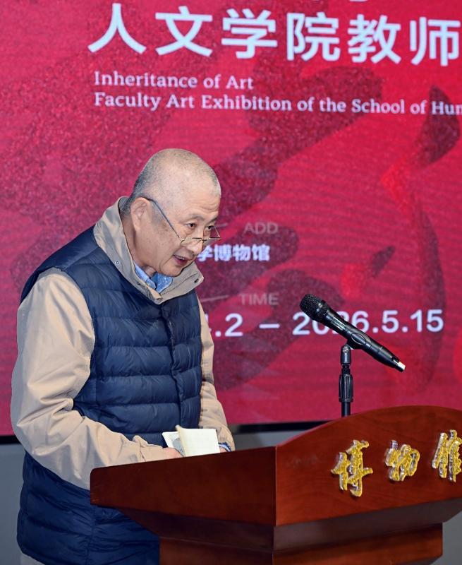 肖云儒教授宣布“艺脉相承——人文学院教师艺术作品展”正式开幕,并分享了三点感受:一是展览极具“隆重感”,高质量书法作品彰显了西安交大艺术专业教育的领先水平;二是观展充满“温暖感”,展厅中先贤与老友佳作交织,仿佛穿越人生历程;三是盛赞交大办学“远见”,指出AI时代人工智能无法替代人类独特的个人生存经验与心理感觉,文科生统摄全局的宏观思维将成为驾驭技术的关键。