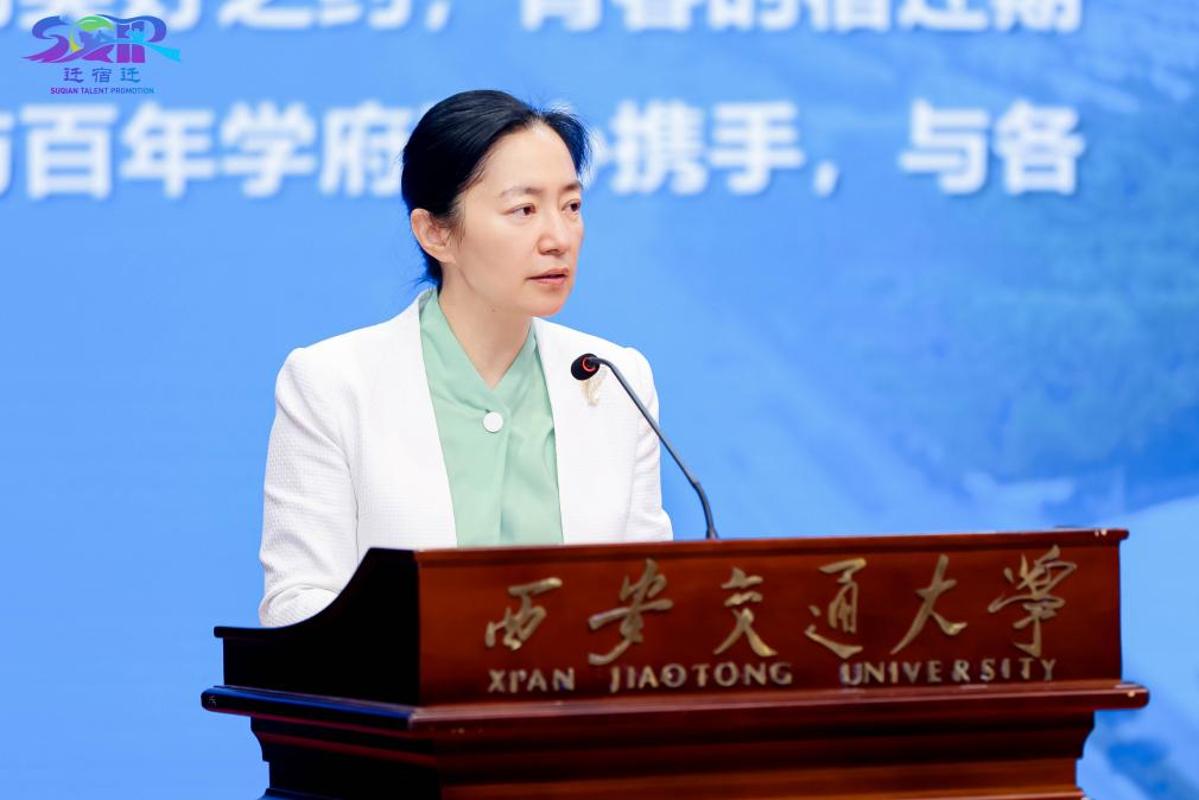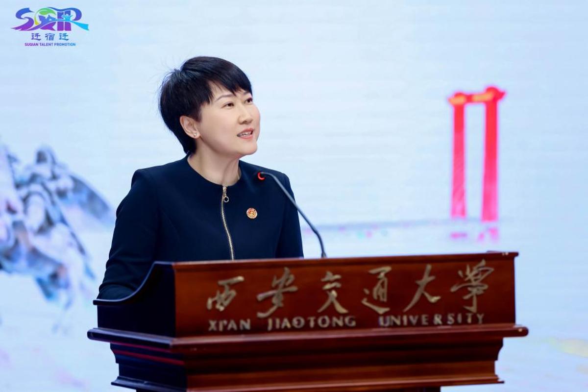 盛蕾代表宿迁市委、市政府,向长期以来关心支持宿迁发展的西安交大各位领导、老师表示衷心感谢,向在西安求学的宿迁籍学子致以诚挚的问候。她表示,宿迁历史悠久、尊贤重才、生态优良、物产丰饶,兼具南北风情,城市发展活力充沛,产业体系完善,交通便捷开放,正着力打造青年发展友好型城市。当前,宿迁持续推出生活补贴、购房扶持、创业资助等一系列人才政策,依托电商、数字经济等优势产业,为青年就业创业提供广阔平台。此次“校园宿迁日”活动,既是校地合作、产创融合的务实之举,也是人城相映、共话青春的美好之约。诚邀广大师生走进宿迁、扎根宿迁,宿迁必将不辜负每一份热爱、不怠慢每一份奋斗,以更好的姿态,与青春同行,共赴美好未来。